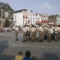 Taxichauffeurs met hun voertuig opgesteld op de westzijde van de Markt nabij de Korte Groenendaal, 08-04-1975. -