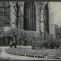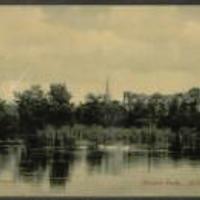 Van Bergen IJzendoornpark, op de achtergrond toren Kleiwegkerk, huizenrij -