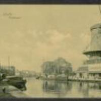 Turfsingel, rechts molen De Rode Leeuw en het gebouw van de Aanlegplaats der Stoomboten, ca. 1910. -