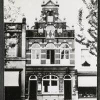 Herinnering aan Gouda. Mapje met opnamen van diverse lokaties. 21-09-1900. Gebouw de Waag aan de Markt met links enkele belendende percelen, o.a. cafe Harmonie. -