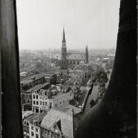 Gezicht over de stad in westelijke richting vanaf de toren van de St. Jan: Gouwe en Gouwekerk - Afbeelding Hoge Gouwe, vanaf de top van de Gouwekerk Lage Gouwe Bolwerk Gouda Vuurvast en pand Nederhorst