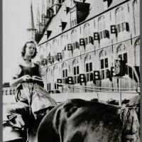 De oostzijgevel van het stadhuis op de Markt met ervoor een kaasmeisje van de V.V.V. op de bok van een paard-en-wagen. c. 1970. - Afbeelding De Punt vanaf de Oosthaven met de molen 't Slot, ca. 1970.