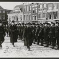 Markt, N.S.B.-bijeenkomst, 1942. Overdracht van het vendel Gouda aan hopman Van der Bijl. Derde van rechts Boere, kapitein IJsel I, later bedienaar van de veerpont over de Turfsingel. -