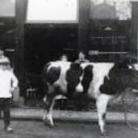 Winkel van slagerij C. Kaars op de hoek Westhaven 36/Korte Noodgodstraat. Vlnr 1. slager C. Kaars, 3. R. Veerman, sigarenwinkelier aan de Turfmarkt, 4. mej. Zambach, 5. mevr. A. Kaars, 6. slager de Wit met koe. Op de voorgrond slagersjongen J. Jongeneel. 1925.