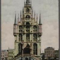 De Markt vanaf de Hoogstraat zuidwaarts met links het stadhuis en de St.-Janstoren, c. 1902. -