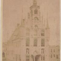 Opname van het stadhuis op de Markt in voor- en zijaanzicht, ca. 1870.