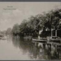 De asschuur aan de Vest met links de Turfsingel. Op de wal een paard-en-wagen met een (olie?)tank, waaruit een werkman staat te pompen ?. 1915. -