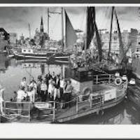 Turfsingel, veel belangstelling bij opening Binnenhavenmuseum. Oude zeilschepen bij Mallegatsluis, met in de verte zicht op de Gouwekerk. Koor 'Eigenwijs' zingt op de boot.