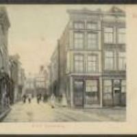 De zuidhoek van de Markt zuidwaarts met links gedeeltelijk het stadhuis, de St.-Janstoren en de Wijdstraat. Afbeelding in met bloemen versierd passepartout. -