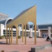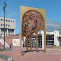 Telepoort op het Stationsplein. Op de achtergrond station Gouda