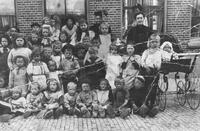 Groepsfoto met vnl. kinderen, waarschijnlijk uit de Willem Tombergstraat. Voorste rij in 't midden (met zwarte hoed) Hendrik Vuijk, 2e rij nr. 4 (vanaf links) met matrozenpet Johannes Jacobus Vuijk (broer van Hendrik). Zijn zoon Albert had later computerwinkel aan de Boelekade. J.J. Vuijk is in 1965